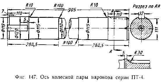 На паровозах старой постройки применялись оси с оуртиками (фиг. 146), на всех вновь строящихся паровозах (9П, ПТ-4, ВП-1) °си без буртиков (фиг. 147). По концам ось имеет подступичные 1*астп увеличенного диаметра, на которые напрессовываются колес
