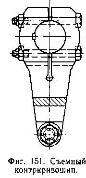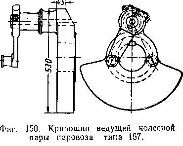 Кривошипы колесных центров ведущих осей имеют еще обратные кривошипы или', так называемые, контркривошипы для передачи движения кулисному механизму. Контркривошипы делаются съемными (фиг. 151) или отковываются заодно с пальцем кривошипа (фиг. 148).