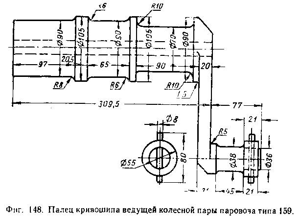 На фиг. 148 изображен палец кривошипа ведущей колесной пары, а га фиг. 149 — сцепной колесной пары.