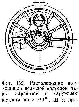 Для определения правой и левой стороны колесной пары на ранных сериях паровозов необходимо знать, что на паровозе с наружным впуском пара контркривошип при переднем ходе паровоза опережает ведущий кривошип (фиг. 152), а при внутреннем впуске, наоборот, отстает от него (фиг. 153). У паровозов серии Од разницы между правой и левой стороной у ведущей колесной пары не имеется, поэтому колесные пары могут подкатываться без учета