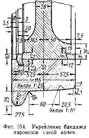 Бандаж (фиг. 154) укрепляется на ободе колесного центра непрерывно по всей окружности; для этого вдоль внутренней кромки обода колесного це(птра на бандаже делается паз для укрепляющего кольца. Кольцо заводят в паз, когда бандаж после насадки еще не успел окончательно остыть, а затем кромки бандажа у паза обжимают ударами ручных или пневматических молотков. Ширина паровозных бандажей делается для широкой колеи 140 и 150 мм, а для узкой 115 мм. Толщина бандажей для широкой колеи 75 мм, а для Узкой 60 и 65 мм.