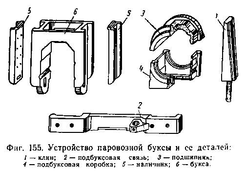 Буксы и подшипники. Осевые буксы передают вес котла, рамы и паровой машины на шейки паровозных осей, а также служат длм правильного расположения осей паровоза относительно рамы. Кроме того, буксы передают на раму усилия, развиваемые паровой машиной, и усилия, возникающие при прохождении паровозом кривых участков в пути и при торможении паровоза. Размеры букс зависят от типа рамы, величины передаваемой буксой нагрузки, расположения рессор и пр. На фиг. 155 изображена букса паровоза