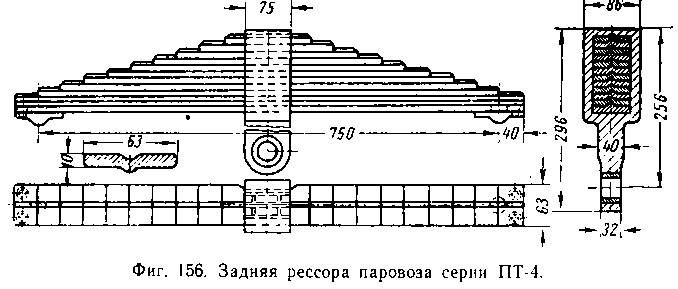 Гибкость рессоры сцепных осей паровоза делается 6—8 мм/т и зависит от размеров листов и качества стали. Рессоры собираются из нескольких, постепенно укорачивающихся и наложенных друг па друга, стальных листов, стягиваемых стальными хомутами (фиг. 156).
