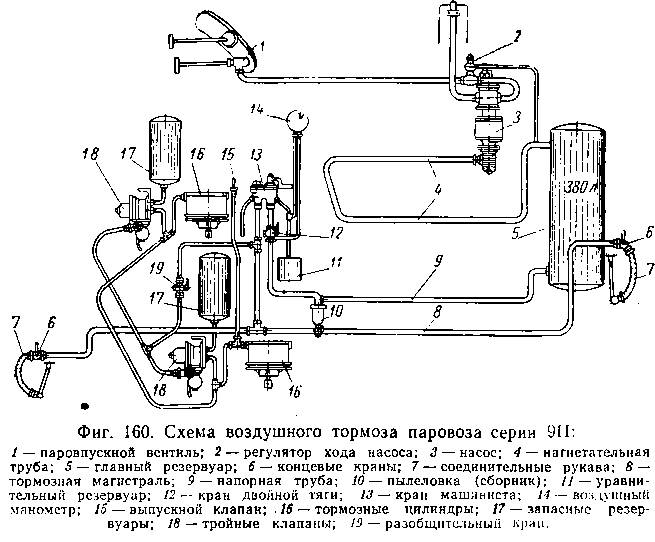 феру часть воздуха из магистрали 8. При этом тройные клапаны приходят в действие и золотники, передвигаясь вместе с поршнями, впускают воздух из запасных резервуаров в тормозные цилиндры, поршни которых, перемещаясь, приводят в движение рычажную передачу и производят нажатие тормозных колодок на колеса. Краном машиниста системы Вестингауз можно производить медленное (служебное) или быстрое (экстренное) торможение, при котором приходят в действие особые ускорители тройных клапанов 18, ускоряющие разрядку магистрали 8 и увеличивающие скорость распространения тормозного действия по поезду и скорость наполнении воздухом тормозных цилиндров 16.