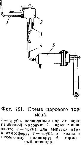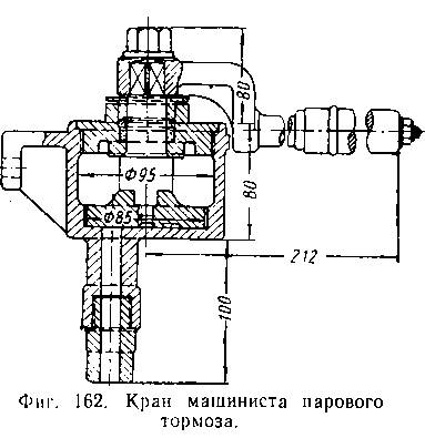 Паровой тормоз (фиг. 161) состоит из установленного в будке крана машиниста (фиг. 162) с тремя подведенными к нему трубками
