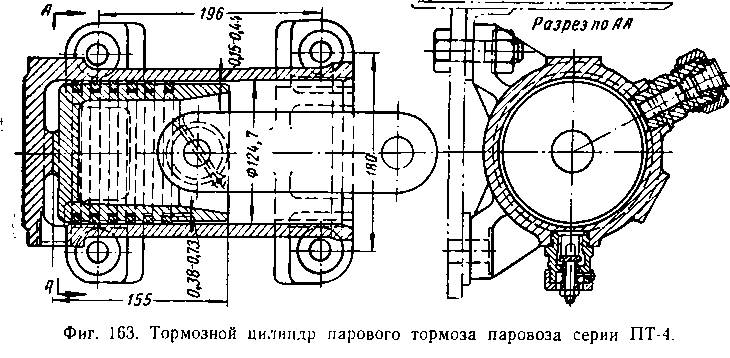 (от пароразборной колонки или паровпускного вентиля, к тормозному Цилиндру и для выхода пара в атмосферу) и горизонтального тормозного цилиндра (фиг. 163), прикрепленного под будкой к раме паровоза. При впуске пара в тормозной цилиндр последний давит на поршень, передвигает его и через шток и систему рычажной передачи передает усилие на тормозные колодки.