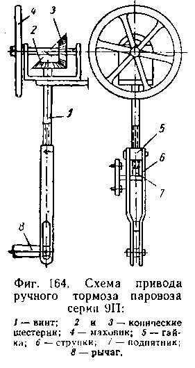 При вращении маховика по часовой стрелке конические шестерни вращают тормозный винт, вследствие чего тормозная гайка вместе со струнками поднимается вверх и тянет за собой задний конец горизонтального рычага 5, который поворачивает главный тормозной вал и передает усилие через рычажную передачу тормозным колодкам. Рычажная передача является общей для ручного и воздушного или парового тормозов.