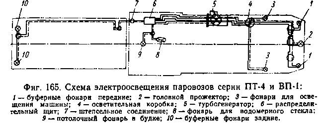 Для обеспечения хорошей видимости в ночное время, а также для освещения контрольных приборов в будке машиниста, все паровозы широкой колеи, а также вновь строящиеся узкоколейные паровозы оборудуются электроосвещением. На фиг. 165 показана схема электроосвещения узкоколейных паровозов ПТ-4 и ВП-1.