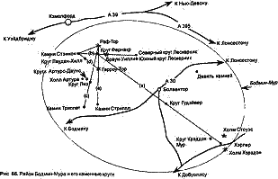 Бодмин-Мур — большая, поросшая вереском гранитная пустошь осталась относительно не потревоженной с доисторических времен, что является редкостью для англйского ландшафта. На севере пирамидальный пик Раф-Тор возвышается на 400 метров (1312 футов). Его ясно видно на много миль вокруг. Неподалеку находится округлый горб Браун-Уилли. Даже будучи чуть выше — 414 метров (1358 футов) — своего соседа, холм уступает ему в качестве точки визирования. Большинство каменных кругов этого района расположено к северу ог магистральной дороги А 30 — главной разделяющей линии пустоши. Но к югу от этой дороги находятся крупнейший тройной круг Хэрлерс плюс малые круги Крэддок-Мургодэйвер и Девять камней Олтарнума (рис. 66).