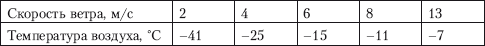 Охлаждение от ветра. Сильный ветер приводит к переохлаждениям и обморожениям даже при умеренно низкой температуре. Ниже приводится таблица, в которой указано соотношение температуры воздуха и скорости ветра, при которых легко могут возникнуть обморожения открытых частей лица.