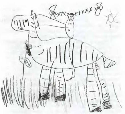Обретя все средства – технические изобразительные средства – для самовыражения, ребенок обретает, наконец, власть над миром. Он может долго, старательно, со всеми подробностями вырисовывать то, что его интересует, поражает, в остальном ограничиваясь самым грубым контуром. Он может изменить ситуацию, в которой пережил стресс, и тем самым преобразовать ее: нарисовать злую собаку маленькой, а себя – с огромной палкой в руках. На этом основана психотерапия через рисунки – впрочем, дети и сами занимаются приведением себя в порядок именно таким образом.