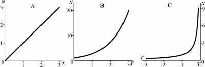 Различные виды зависимости роста населения от времени: A -- линейный рост, B -- экспоненциальный рост, С -- гиперболический рост