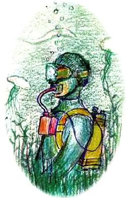Кислородный прибор Натальи Радецкой. В красной коробочке на груди водолаза происходит электролиз воды. Кислород по шлангу направляется для дыхания, а ненужный для дыхания водород выбрасывается наружу. Электричество поступает от батареи на спине водолаза.