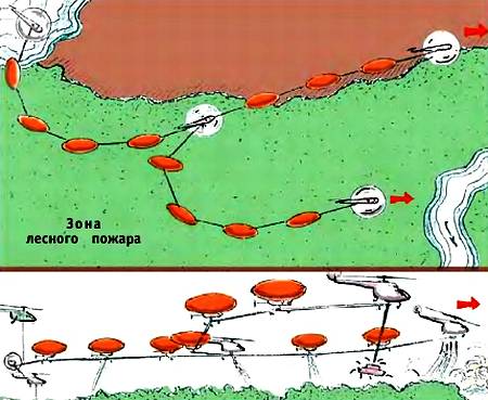 Лесные пожары порой принимают такие масштабы, что к борьбе с ними широко привлекается авиация. Специальные самолеты и вертолеты садятся на реке или на озере, быстро заправляются водой и выливают ее на горящий лес.