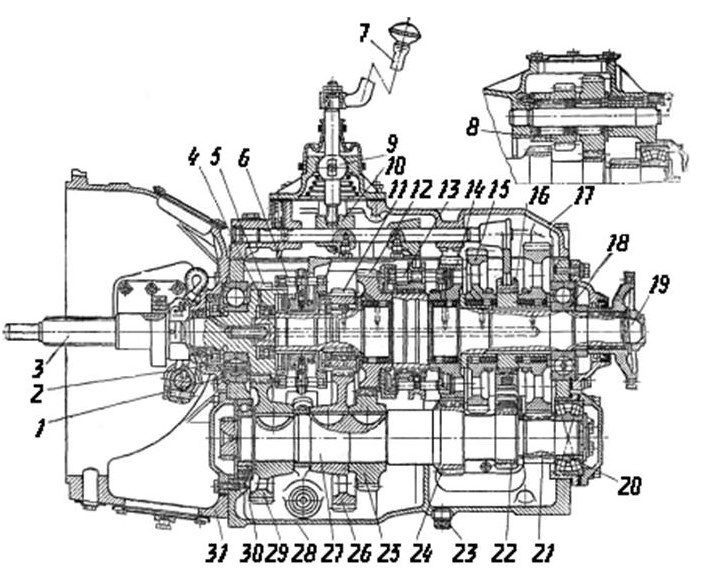 1,18 – шарикоподшипники; 2 – маслонагнетательное кольцо; 3-первичный вал; 4, 20, 30 – роликоподшипники; 5 – шестерня первичного вала; 6 – синхронизатор четвёртой – пятой передач; 7 – рычаг переключения передач; 8 – блок шестерён заднего хода; 9 – шаровая опора рычага переключения передач; 10 – головка ползуна вилки второй и третьей передач; 11 – шестерня пятой передачи вторичного вала; 12 – шестерня третьей передачи вторичного вала; 13 – синхронизатор второй-третьей передач; 14 – шестерня второй передачи промежуточного вала; 15 – шестерня заднего хода вторичного вала; 16 – муфта включения первой передачи и заднего хода; 17 – крышка картера коробки передач; 19 – вторичный вал; 21 – шестерня первой передачи промежуточного вала; 22 – шестерня заднего хода промежуточного вала; 23 – пробка сливная; 24 – шестерня второй передачи промежуточного вала; 25 – шестерня третьей передачи промежуточного вала; 26 – шестерня пятой передачи промежуточного вала; 27 – промежуточный вал; 28 – картер коробки передач; 29 – шестерня привода промежуточного вала; 31 – картер сцепления