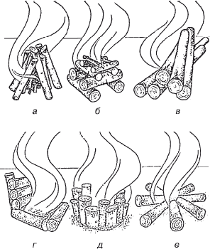 Из других видов костров могут быть рекомендованы «камин», «полинезийский», «звездный». Особенности их укладки видны на рис. 7.2, г, д, е.