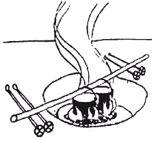 «Колодец». Это один из видов жарких костров. Его складывают из более или менее толстых коротких поленьев, положенных рядами (рис. 7.2, б). Медленно сгорая, поленья образуют много углей, дающих высокую температуру. Такой костер удобен для приготовления пищи, а также обогрева и сушки одежды.