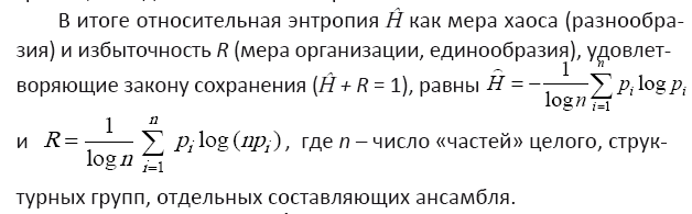 Надо заметить, что к разряду самоорганизующихся относятся не только многие системы неорганической природы (например, так называемые твердые растворы, композиты и др.), но практически все биологические системы и системы социального порядка. Биосистемы, включая популяции, сообщества, системы экологические, представляют собою внутренне дифференцированные самоорганизующиеся формирования, важнейшие свойства которых выражаемы коллективными переменными – интегральными характеристиками. Одна из них – информационная энтропия, способная быть мерой состояния распределенных сложносоставных систем, внутреннего разнообразия систем и распределений как локальных универсумов, мерой внутриструктурного хаоса. Условия для их устойчивого развития возможны лишь в том случае, когда производимый внутри них хаос подавляется организацией, т. е. когда мера организации полностью, без остатка исчерпывает меру хаоса, не оставляя лазеек для возмущающих систему воздействий, способных обгонять в своем росте темпы застройки внутрисистемных порядков.