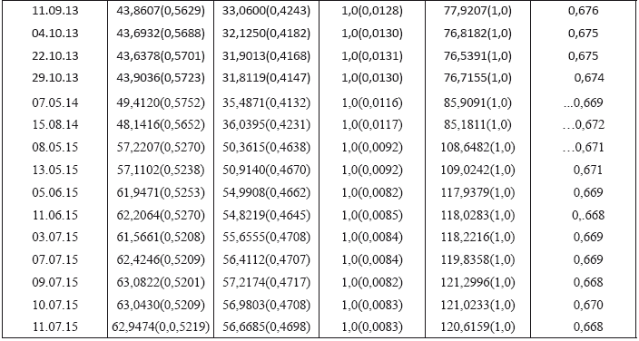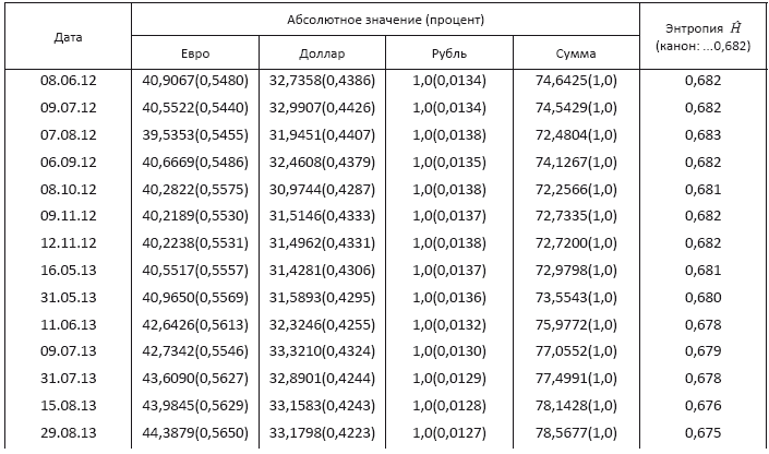 Данные Табл. 2 показывают: системой-триадой «евро + доллар + рубль» в течение года, с весны 2012 по июнь 2013 г., выдерживается устойчивое гармоничное состояние, о чем свидетельствует узловое значение ее интегральной меры – относительной информационной энтропии: ? – 0,682. Затем эта система-триада проявляет тенденцию медленного, но неуклонного стремления к состоянию дисгармоничного распределения своих компонентов.