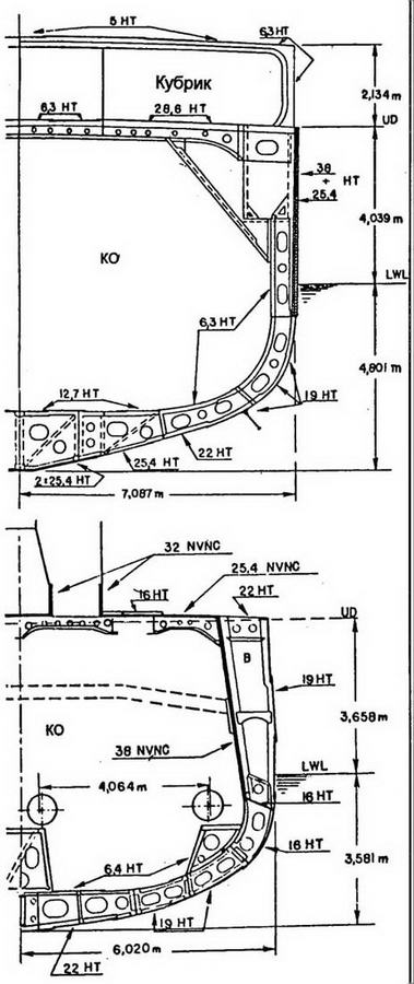 3. Отсутствие обшивки за бортовой броней, использование брони борта и палубы для увеличения продольной прочности корпуса.
