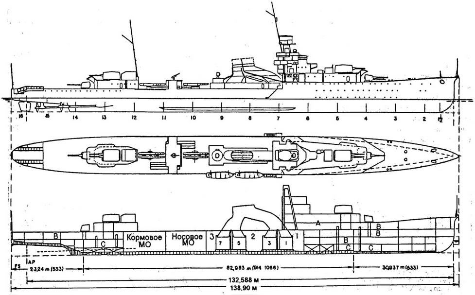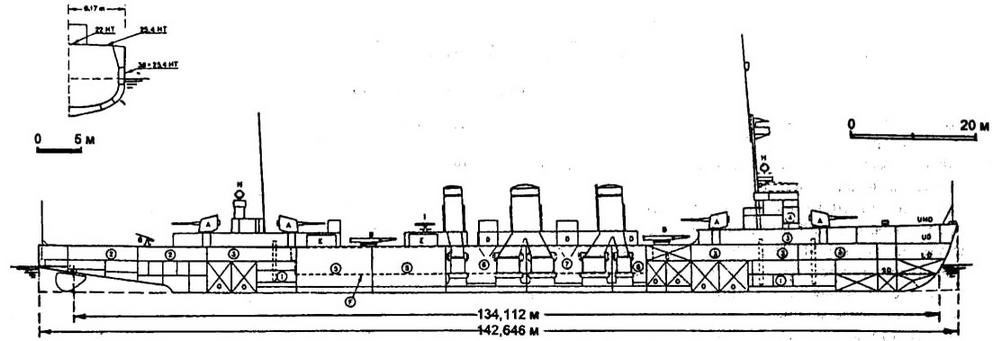 1- погреба боезапаса; 2 - каюты офицеров; 3 - кубрики экипажа; 4 - броневая юоевая рубка; 5 - турбинные отделения (2 тЗА Браун-Кертис в носовом и 1 в кормовом): 6,7,8 - котельные отделения (2 “малых” нефтяных в носовом, 4 “больших” нефтяных в среднем, 2 ‘больших’ нефтяных и 2 “малых” смешанного отопления в кормовом). Общая мощность 51000 л.с, скорость 33,4 уз., 3 винта диаметром 3,048 м. А - 4 14—см/50 орудия типа 3 года в пьедестальных установках с ручным обслуживанием; В - 2x3 533-мм ТА для торпед типа 6 года; С - угольные бункеры (150 т); D и Е - воздухозаборники КО и МО; F - контур броневого пояса; G - зенитное в-см/40 орудие; Н - 90-см прожектор типа “SU"; I - 2,5-м дальномер; О - нефть 920 т