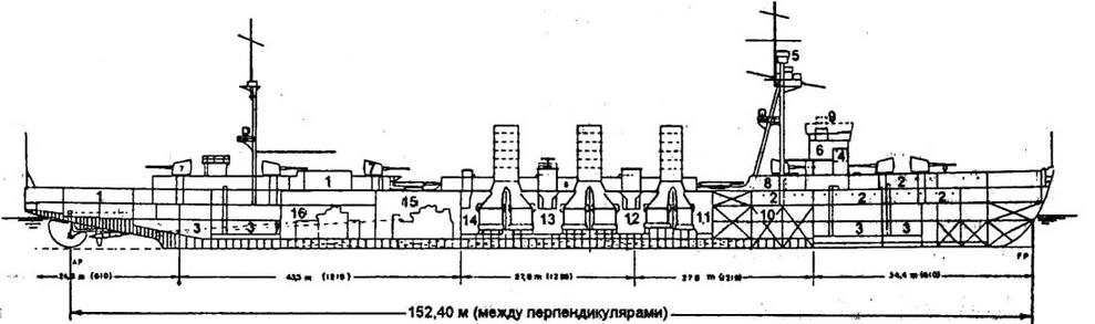 1 - офицерские каюты; 2 - кубрики; 3 - погреба боезапаса; 4 - броневая боевая рубка; 5 - директор типа 13; 6 - ходовая рубка; 7 14-см/50 орудие; 8 - запасные торпеды; 9 - брезентовый обвес мостика и площадка под дальномер; 10 - нефтяная цистерна; 11-14,- котельные отделения (№1 - 2 “малых” котла смешанного отопления; №2 - 4 “средних” нефтяных; №3 - 4 и №4 - 2 “больших” нефтяных); 15, 16 • носовое и кормовое турбинные отделения)