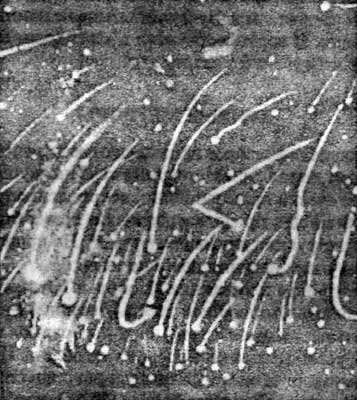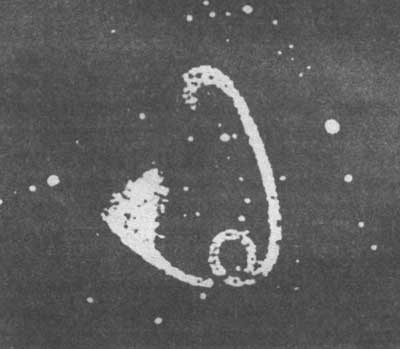 «Из ряда вон выходящий метеор наблюдал 16 октября 1903 г. Перец-дель-Пульгар, директор метеорологической обсерватории в Мадриде… Около 10 часов вечера внимание наблюдателя было привлечено вспышкой в небе, яркость которой можно было сравнить с яркостью полной луны. Вспышка эта была вызвана появлением метеора, имевшего форму ленты с петлей посередине» (см. рис 54).