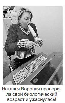 Корреспондент «Комсомольской правды» Наталья Анисимова (Вороная) прошла тестирование на аппарате, который определяет реальный возраст организма, и… пришла в ужас (см. на сайте kp.ru).