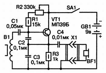На транзисторе VT1 собран звуковой генератор по схеме индуктивной трехтонки. Колебания звуковой частоты с эмиттера транзистора через разделительный конденсатор С4 поступают на головные телефоны, которые воспроизводят звуковой сигнал. Переменным резистором R2 можно регулировать чувствительность устройства.