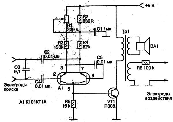 Устройство содержит мультивибратор, собранный на лавинных транзисторах микросхемы К101КТ1А. Частота вырабатываемых им колебаний определяется сопротивлением резистора R1 и емкостью конденсатора С3. При разомкнутой цепи электродов поиска частота колебаний выше порога слышимости. В процессе поиска биологически активной точки один электрод держится пациентом в руке, а второй равномерно перемещается по коже. Попадание электрода на биологически активные точки сопровождается резким уменьшением частоты колебаний, которые воспроизводятся динамической головкой ВА1. Частоту колебаний можно регулировать переменным резистором R1. Трансформатор Тр1, а также и динамическая головка могут быть взяты от громкоговорителя для радиотрансляционной сети.