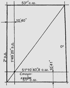 С долготой Стоунхенджа сложнее, ее приходится определять по карте масштаба 1 : 1 250 000. Там она равна 1°49'20"з.д. (западной долготы!). Но и этого достаточно, чтобы заметить, что Стоунхендж установлен на геодезической диагонали геодезического квадрата: