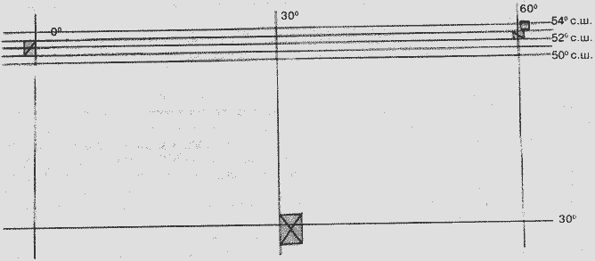 Условно назовем этот квадрат "квадратом Стоунхенджа" (рис. 137). С абсолютной точностью он займет свое место в глобальной сети. Базовый меридиан Британии – 0°, базовая параллель (возможно!) 53° с.ш. Геодезический квадрат Стоунхенджа расположен к западу от опорного меридиана. Обнаруживается отчетливая геодезическая схема (рис. 138) с шагом по долготе в 30°00'00".