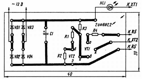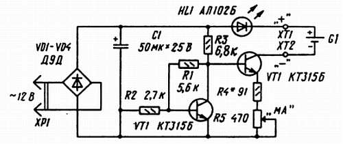 Ток заряда в пределах от 2,5 до 14 мА определяется сопротивлением переменного резистора R5 и поддерживается стабильным не только в течение заряда, но даже при коротком замыкании зажимов ХТ1 и ХТ2. Светодиод HL1 сигнализирует о наличии тока через выходные клеммы.