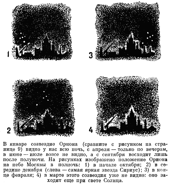 Выходит, будто вся «небесная твердь» постоянно сдвигается от востока к западу. Поэтому и меняется еженощно вид звездного неба. Особенно заметны эти перемены, если наблюдать отдельные созвездия из месяца в месяц.