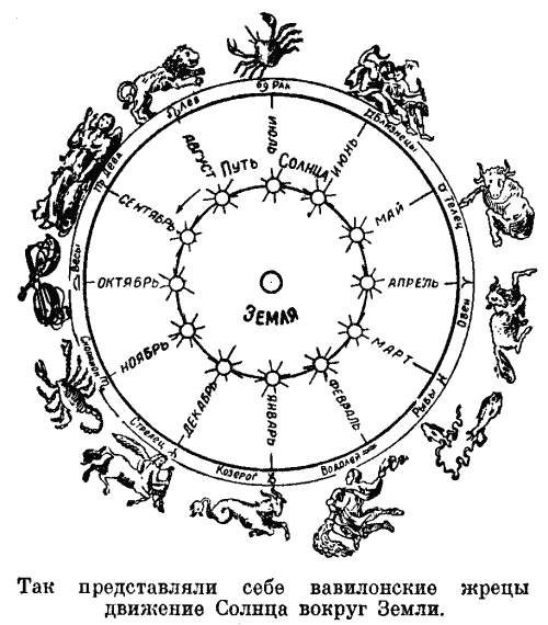 Но мало сделать открытие — нужно правильно объяснить его. Жрецы неверно истолковали свои наблюдения: Солнце каждый день движется по небу с востока к западу, как и все звезды, но, подобно Луне, отстает от них и понемногу отступает в противоположную сторону — от запада к востоку. Вот почему оно и кочует по всем созвездиям зодиака.
