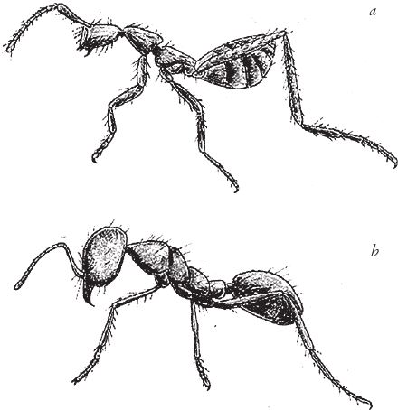 Рис. 1.2. Неслучайное, хотя и не запланированное, сходство. Жук, который мимикрировал под муравья, Labidus praedator (а) и муравей, Mimeciton Antennatum (b).