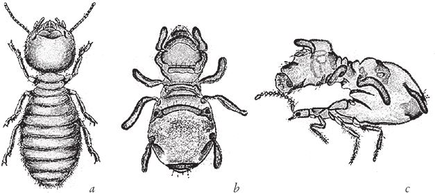 Рис. 1.3. (а) Настоящий термит, Amitermes hastatus; (b) жук, который мимикрировал под термита, Coatonachthodes ovambolandicus; (с) вот в чем секрет фокуса.