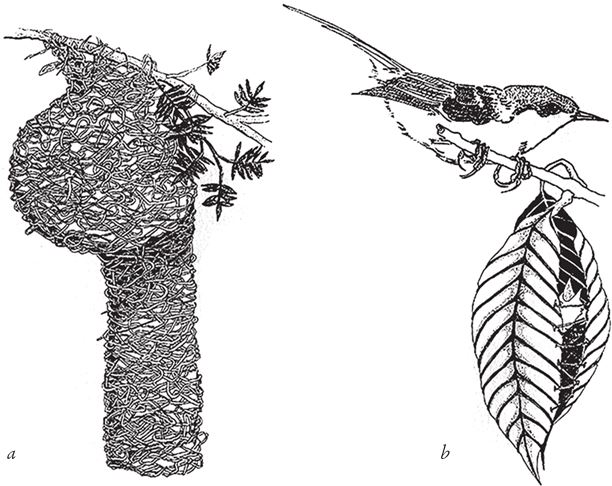 Рис. 1.7. Мастера псевдодизайна. Гнезда птиц ткачика (а) и портнихи Orthotomus sutorius (b).