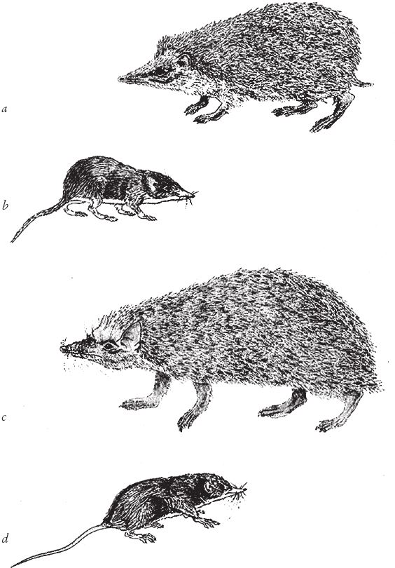 Рис. 1.9. Животные с одинаковыми потребностями зачастую больше похожи друг на друга, чем на своих ближайших родственников. Алжирского ежа, Erinaceus algirus (а), и землеройкового ежа, Neotetracus sinensis (b), связывает близкое родство. Большой ежовый тенрек, Seifer setosus (c) – кузен длиннохвостого тенрека, Microgale melanorrachis (d).