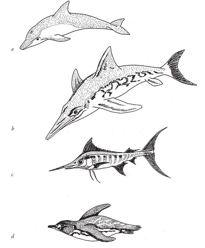 Рис. 1.10. Конвергентная эволюция: независимое развитие обтекаемых форм. (а) Афалина, Tusiops truncates; (b) Ichthyosaurus; (c) синий [атлантический голубой] марлин, Makaira nigricans; (d) галапагосский пингвин, Spheniscus mendiculos.