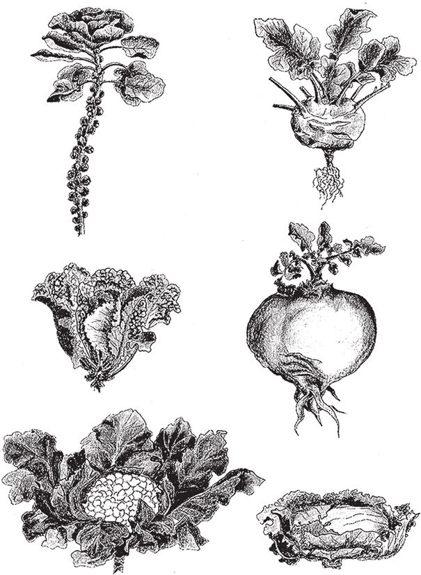 Рис. 1.13. У всех этих овощей общий предок – дикая капуста, Brassica olearacea; сверху слева по часовой стрелке: брюссельская капуста, кольраби, полевая капуста, полукочанная капуста, цветная капуста, савойская капуста.