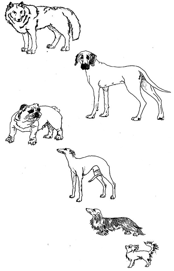 Рис. 1.14. Возможности селекции при выведении пород собак. Люди вывели все эти породы от волка (вверху), их общего дикого предка; сверху вниз: датский дог, английский бульдог, гончая, длинношерстная такса, длинношерстная чихуахуа.