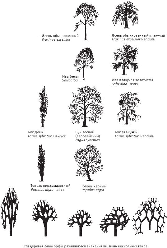 Рис. 1.15. Рисунки настоящих и компьютерных биоморфных деревьев показывают, как может измениться форма вида из-за незначительной коррекции механизма роста. Крона одних деревьев обвисает, как у плакучей ивы, в то время как другие устремляются ввысь, как пирамидальный тополь.