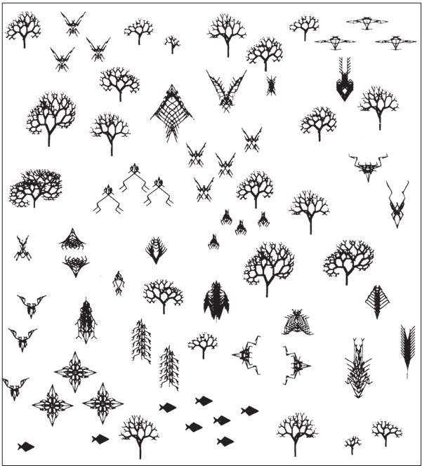 Рис. 1.16. “Зоопарк” черно-белых биоморфов, выведенных в программе “Слепой часовщик”.