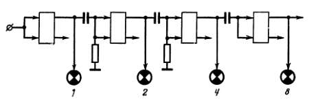 Триггер 1 включен так, что каждый импульс, посылаемый на управляемый им ключ, стремится переключить триггер 2 в такое же положение, в каком находится триггер 1. Точно так же устроена связь между триггерами 2 и 3, между 3 и 4 и между 4 и 5.