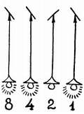 После прохождения некоторого количества импульсов мне останется лишь выписать числа под горящими лампочками и сложить их. Сумма даст мне количество поступивших импульсов. Как ты видишь, прибавляя новый каскад, я каждый раз удваиваю максимальное число. Так, с помощью цепочки из десяти каскадов я могу считать до 1024, а при наличии 11, 12 и 13 каскадов мои возможности считать увеличиваются соответственно до 2048, 4096 и 8192. Ты видишь, что предел растет довольно быстро.