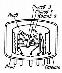 Л. — Ты видел наиболее современный вариант индикатора — газонаполненную лампу цифровой индикации. Индикаторная лампа имеет анод цилиндрической формы и 10 катодов из очень тонкой проволоки, расположенных один за другим; каждый катод имеет форму определенной цифры (рис. 118).