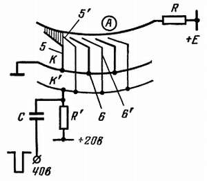 Напряжение питания Е (300 или 400 в) подается на анод через резистор R. Основные катоды К замкнуты на корпус, а все вторичные катоды К' имеют невысокий положительный потенциал. Ионизация начинается на одном из основных катодов К. Предположим, что им окажется катод с номером 5, как я показал на своем рисунке. А теперь через конденсатор С подадим отрицательный импульс с амплитудой 40 в на вспомогательные катоды К'. Они станут отрицательными относительно катодов К, потому что первоначально они имели потенциал +20 в, и конденсатор полностью передает срез импульса. Разность потенциалов между анодом А и катодом К' стала больше разности потенциалов между анодом А и катодами К, и поэтому ионизация стремится теперь установиться между анодом и одним из катодов К'.