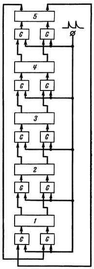 Рис. 124. Устройство «кольца Реженера», позволяющего считать до 10. В устройстве имеется пять триггеров с двумя устойчивыми состояниями и десять ключей (G), направляющих пусковые импульсы по-правильному адресу.