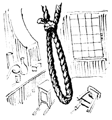 Тогда алхимик отцепил шелковый шнур от портьеры, перекинул его через дубовую балку в потолке лаборатории и на конце сделал петлю. «Лучше умереть самому, чем каждый день ждать казни», решил он. Его вынули из петли и привели в чувство.